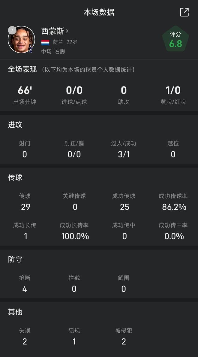 雷速體育11月2日訊 在今天凌晨進行的熱刺主場vs切爾西的英超比賽中,哈維·西蒙斯第7分鐘替換上場表現平淡,在第73分鐘被換下。